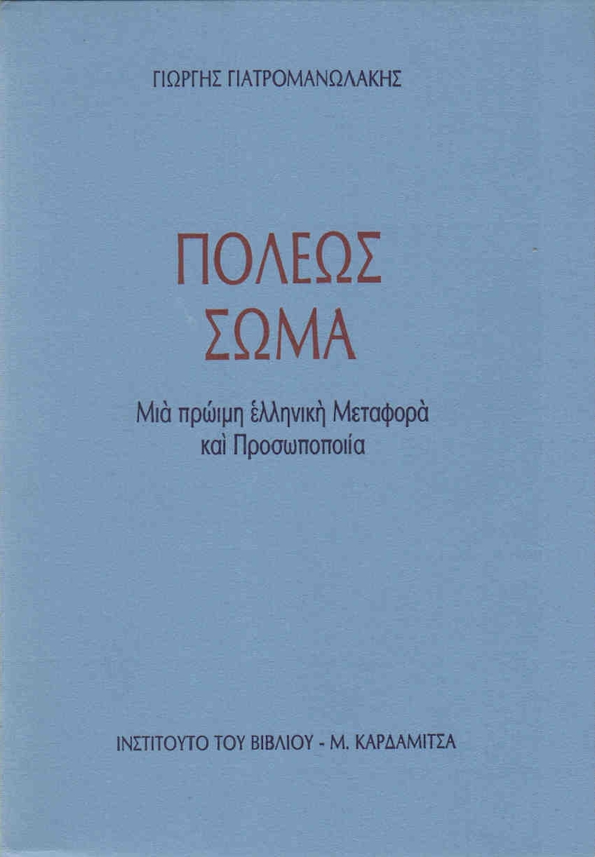 Η παρούσα μελέτη δεν φιλοδοξεί να ερευνήσει και να απαριθμήσει τις πολλές και ποικίλες προσωποποιίες της πόλεως ή τις συναφείς «σωματικές» μεταφορές που μπορεί κάποιος να συναντήσει στην αρχαία ελληνική γραμματεία. Άλλωστε από ένα σημείο και πέρα η απαρίθμηση ομοειδών παραδειγμάτων δεν θα είχε νόημα. Εκείνο το οποίο πρωτίστως μας ενδιαφέρει είναι να διερευνήσουμε τις απαρχές της «σωματικής» μεταφοράς της πόλεως (και των συναφών εννοιών), να συλλέξουμε και να ερμηνεύσουμε κατά κύριο λόγο τις αρχικές περιπτώσεις των σχετικών μεταφορών και προσωποποιήσεων. Κατά συνέπεια η έρευνα θα περιορισθεί στον Όμηρο, στον Ησίοδο και στον Σόλωνα επειδή εδώ στις αρχές της ελληνικής και ευρωπαϊκής λογοτεχνίας εμφανίζεται για πρώτη φορά η ιδέα της ζωντανής πόλεως (ή πολιτείας) και εδώ, αφού η μεταφορά αυτή περάσει διάφορους αναβαθμούς, θα ολοκληρωθεί και θα παγιωθεί σε ένα πλήρες ποιητικό και ρητορικό σχήμα. Φυσικά, όπως εύκολα μπορεί ο αναγνώστης να διαπιστώσει, υπάρχουν πλήθος αναφορών σε μεταγενέστερους συγγραφείς προκειμένου να τεκμηριωθούν οι θέσεις μας. Όμως εκεί όπου η εργασία προσπαθεί να εξαντλήσει το αντικείμενό της είναι οι τρεις παραπάνω ποιητές. (. . .) (ΑΠΟ ΤΟΝ ΠΡΟΛΟΓΟ ΤΗΣ ΕΚΔΟΣΗΣ)